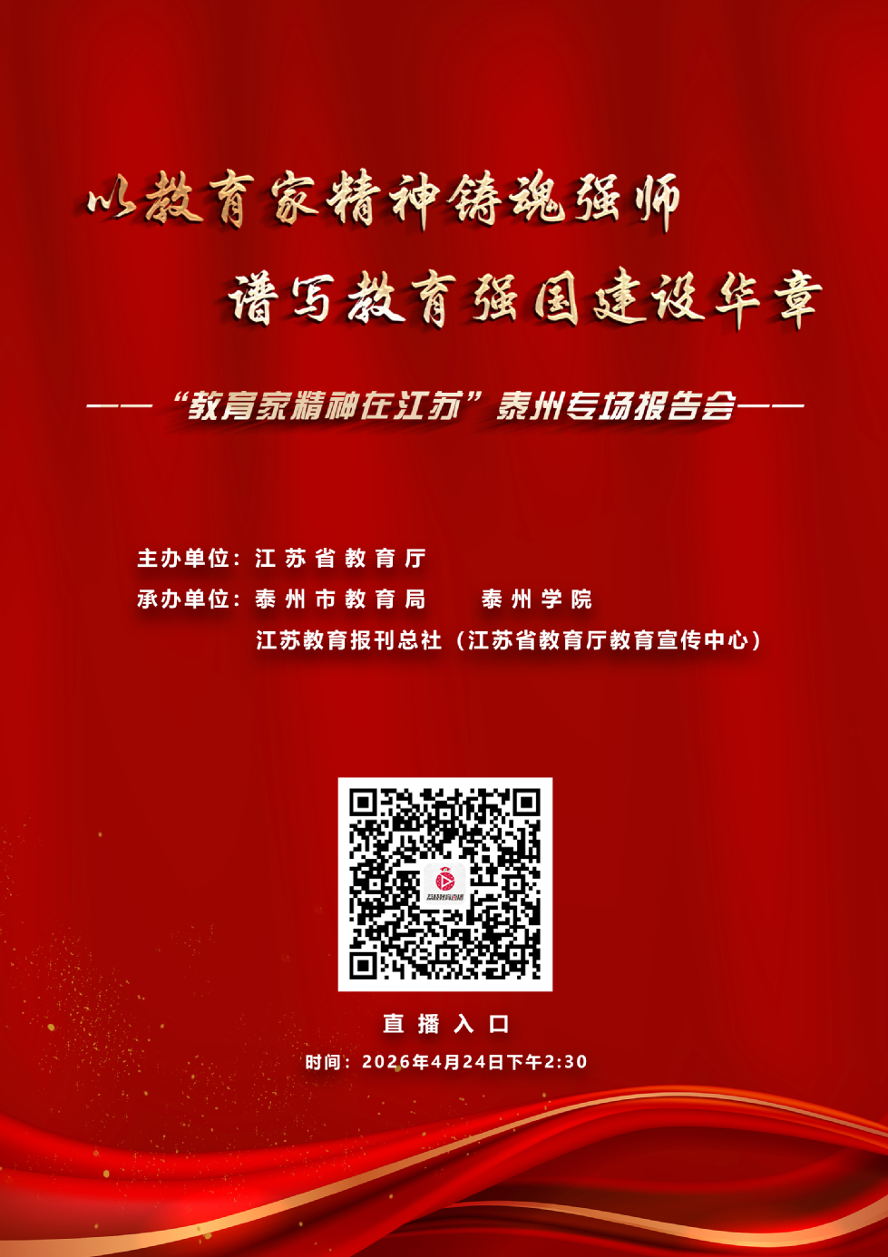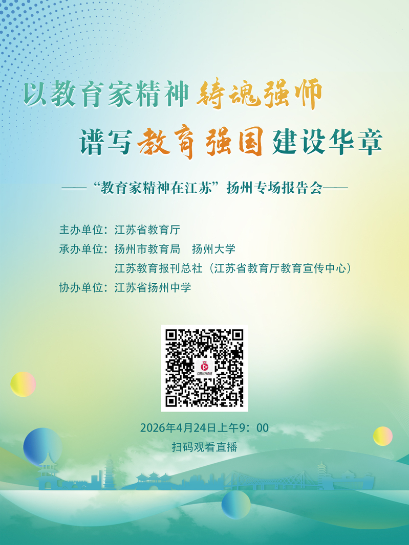 由江苏省教育厅主办的“教育家精神在江苏”专场报告会将于2026年4月24日(本周五)在扬州和泰州两地举行。为大力弘扬教育家精神,激励广大教师和教育工作者坚守初心、立德树人,请全体教职工积极扫码进入直播入口,参与线上学习。希望大家共同汲取榜样力量,将教育家精神切实融入日常育人工作当中。